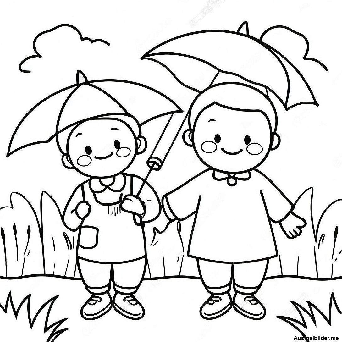 Druckbare PDF von Glückliche Kinder Mit Regenschirmen Ausmalbild herunterladen
