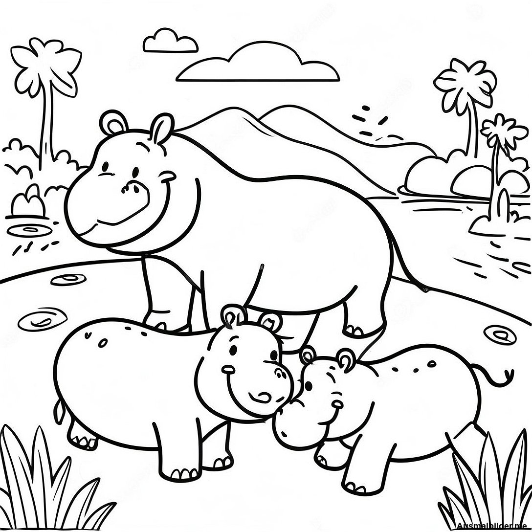 Nilpferdfamilie, Die Am Fluss Entspannt Ausmalbild
