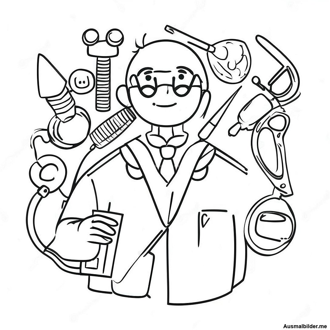 Druckbare PDF von Schlauer Arzt Mit Medizinischen Werkzeugen Ausmalbild herunterladen
