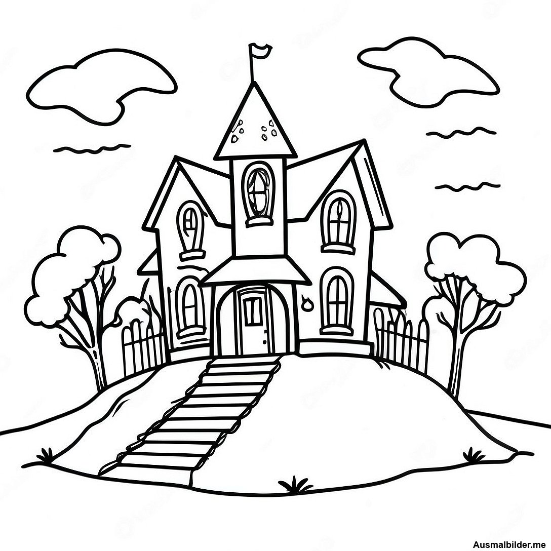 Druckbare PDF von Spukhaus Auf Einem Hügel Ausmalbild herunterladen