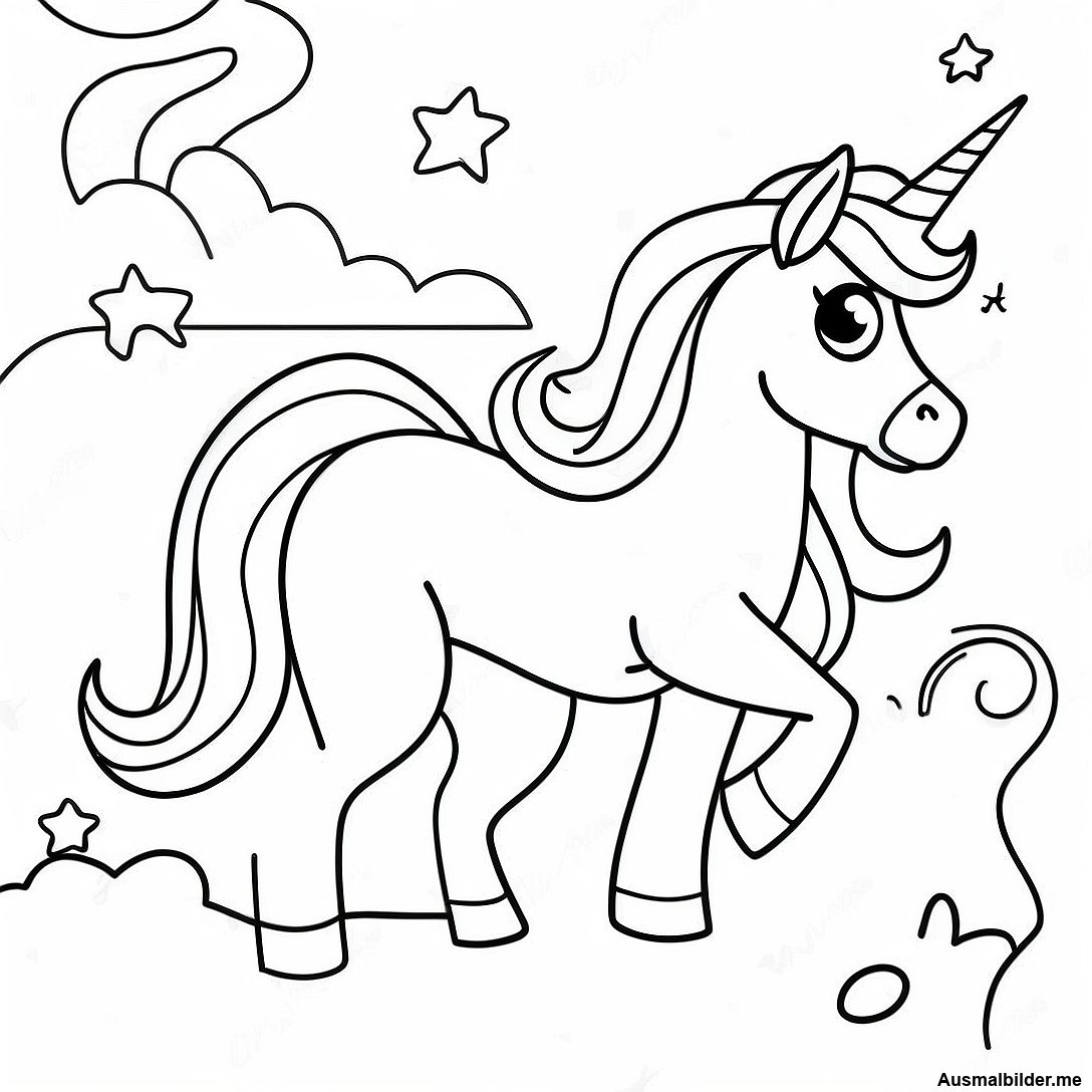Verspieltes Einhorn, das durch Wolken läuft-Ausmalbild
